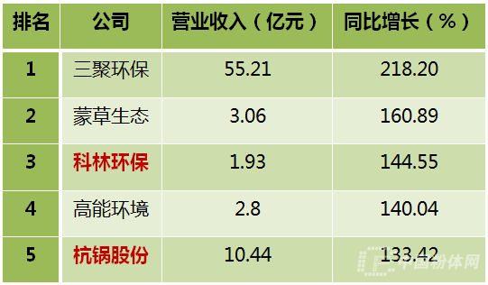 表2 2017年一季度中國環(huán)保上市企業(yè)營業(yè)收入增速TOP5